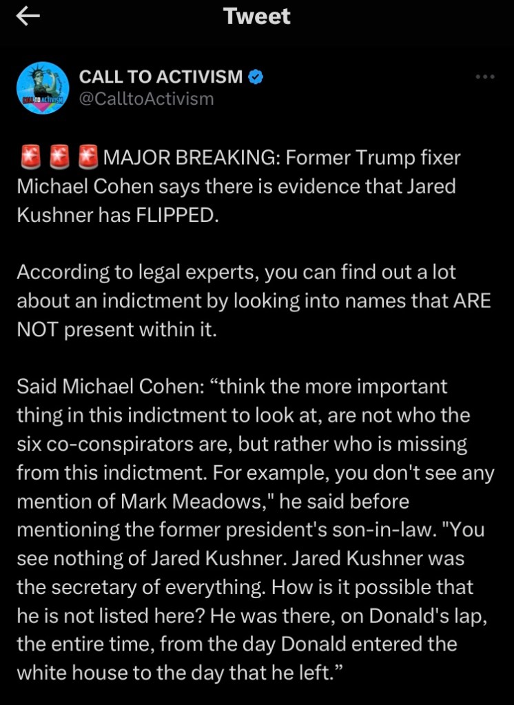 The Indictment’s Missing Links: Cohen’s argument primarily revolves around the absence of certain names from the indictment. While six co-conspirators were mentioned, notable figures like Kushner and Meadows were conspicuously missing. According to legal experts, the omission of prominent names can indeed provide insights into ongoing investigations and potential cooperation agreements. However, it’s crucial to remember that the absence of a name in an indictment does not automatically indicate cooperation.