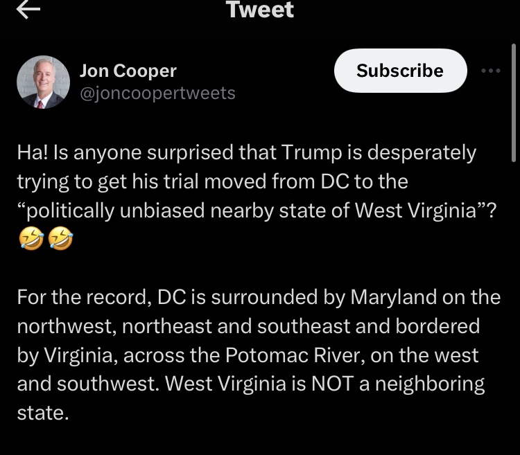 In a recent tweet, Jon Cooper highlighted former President Donald Trump’s alleged attempt to move his trial from Washington D.C. to the “politically unbiased nearby state of West Virginia.” The tweet humorously pointed out the geographical inaccuracy of West Virginia being a neighboring state to D.C. and raised questions about Trump’s motives in seeking such a relocation.